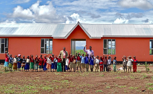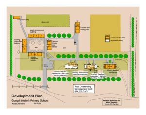 The Gongali (Aslini) School is located about 14 km south of Karatu in a farmland area producing crops of maize, sunflower, beans and pidgeon pea. Since the first two classrooms were built in 2010, it has grown steadily to now include a Kitchen/Dining Room, all 7 classrooms and 4 teacher residences. The only remaining buildings are a Library/Teacher Room building and 2 more teacher residences. This school has been developed as the model for all PSFA projects; a community where the buildings have multipurpose use, crops and gardens are grown by the teachers’ families, and a place for children to grow up. Because the site has piped gravity-fed water and electricity, the Mayor has decided to relocate Village offices here, and plans are being made to build a church at the site.